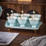 طقم آيس كريم وجيلي بورسلين فاخر مصمم خصيصًا ليجمع بين الأناقة والعملية، ويضيف لمسة راقية على سفرتك في المناسبات والعزومات. الطقم مكوّن من أطباق بورسلين مزخرفة بنقشة رقيقة، مع تقديم على صينية ثابتة بأرجل معدنية لمظهر أكثر فخامة.