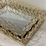 صينية ديكور ذهبية بمرآة تضيف لمسة فاخرة وأنيقة لأي ركن في منزلك. تتميز بتصميم راقٍ بإطار ذهبي ولمسة مرآة عاكسة تعزز من جمال المكان.