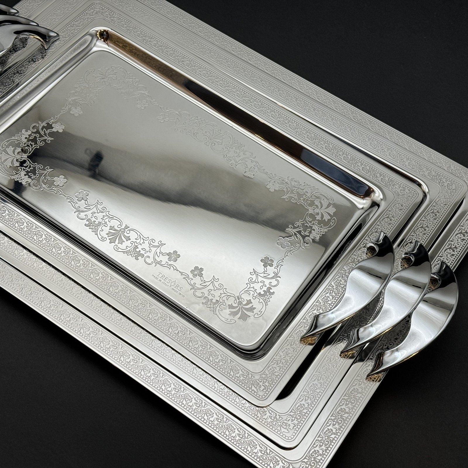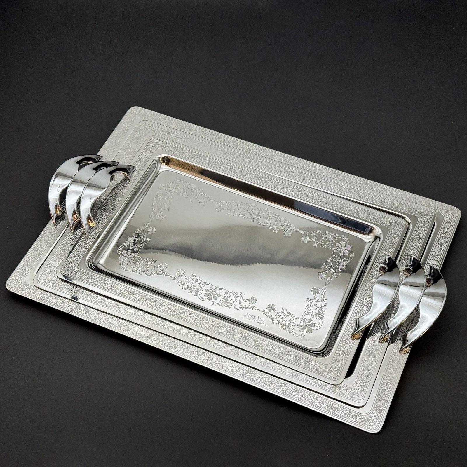 صواني بتصميم راقٍ من الستانلس ستيل اللامع تمنحك مزيجًا مثاليًا من المتانة والأناقة – مناسبة للتقديم أو للزينة في كل المناسبات.