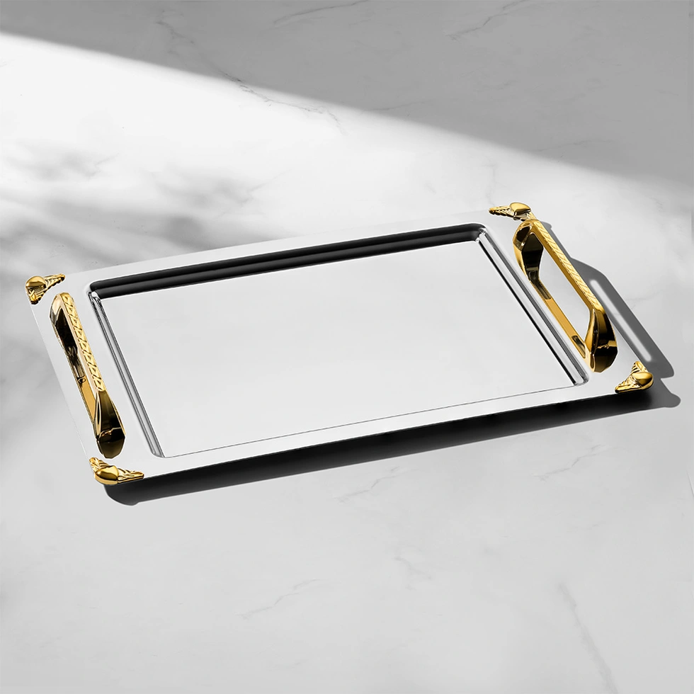 الوصف:طقم صواني بتصميم فاخر بلمسة ذهبية مطفية، مصنوع من خامة استانلس ستيل عالية الجودة (18/10) مقاومة للصدأ.مثالي للتقديم في المناسبات والضيافة اليومية، ويجمع بين المتانة والأناقة العصرية.