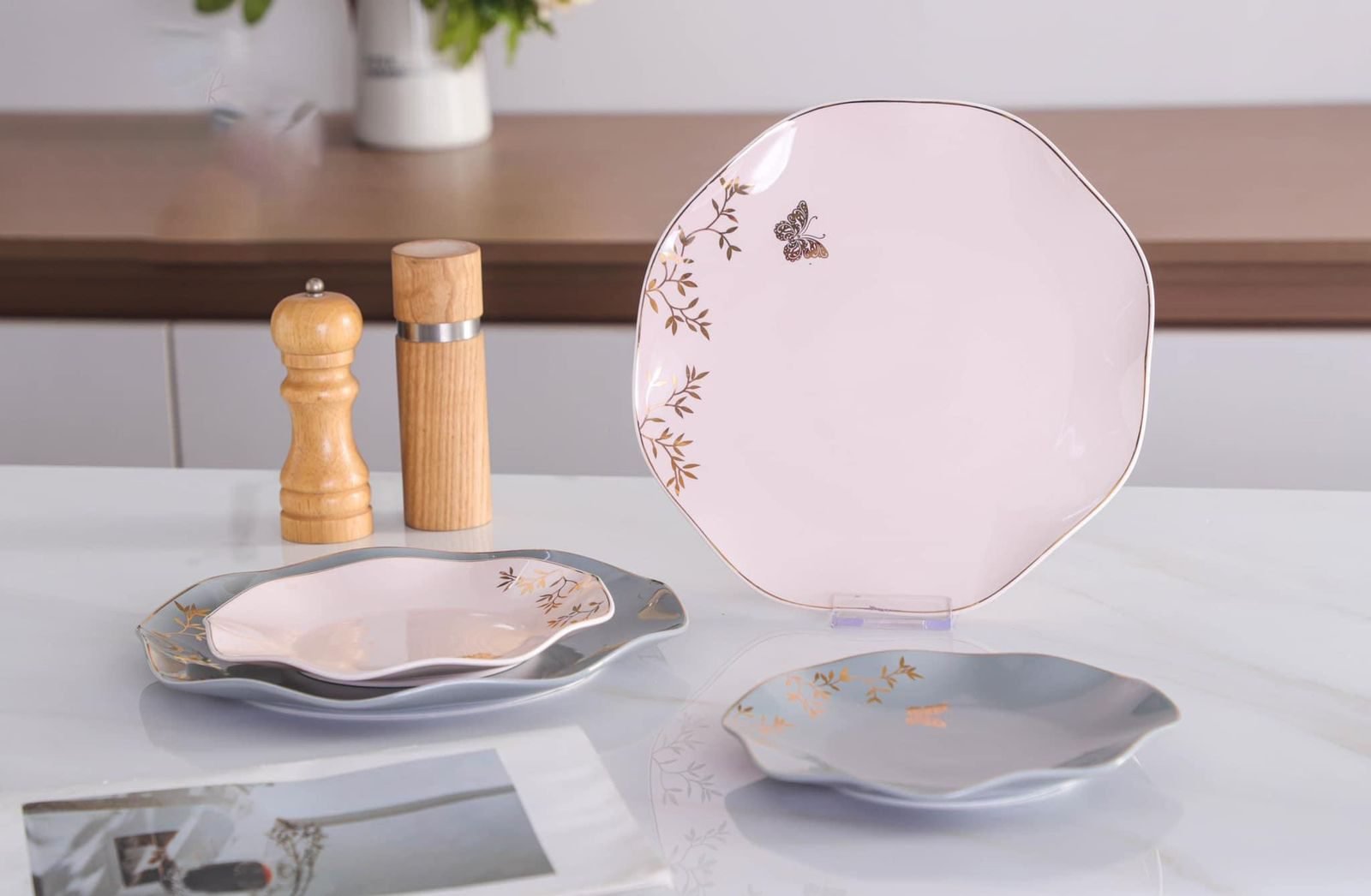 طقم عشاء فاخر بتصميم فراشات راقٍ وتفاصيل مطلية بالذهب عيار 24، يعكس ذوقًا مميزًا وفخامة لا مثيل لها على سفرتك. مثالي للعزومات والمناسبات الخاصة، كما يضفي لمسة ملكية على الاستخدام اليومي.