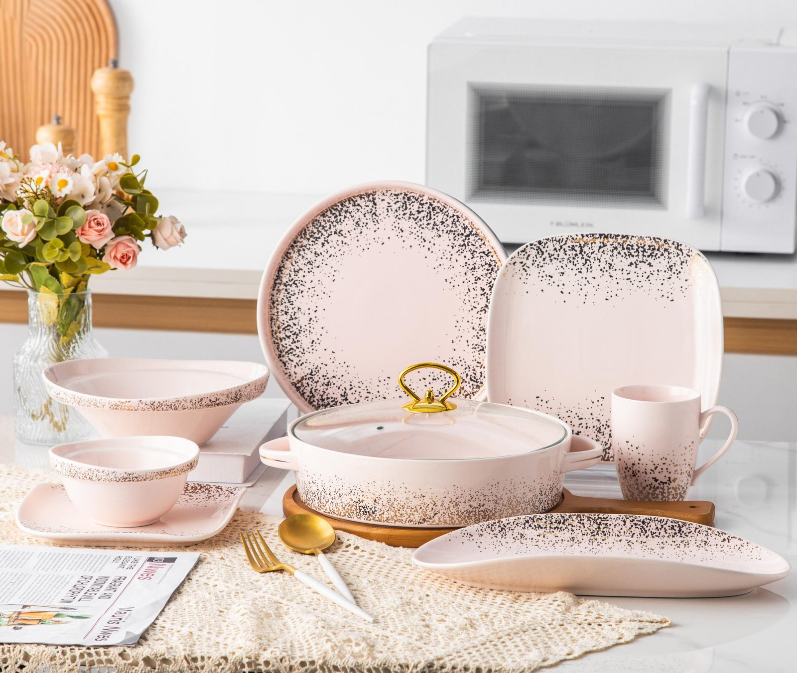 طقم عشاء فاخر بنقشة نقط ذهبية أنيقة، تصميم عصري يضفي لمسة فخامة وإشراقة على كل مناسبة. مصنوع من بورسلين عالي الجودة، آمن للاستخدام في الميكروويف وغسالة الأطباق، ليوفر لك تجربة عملية بجانب المظهر الراقي.