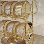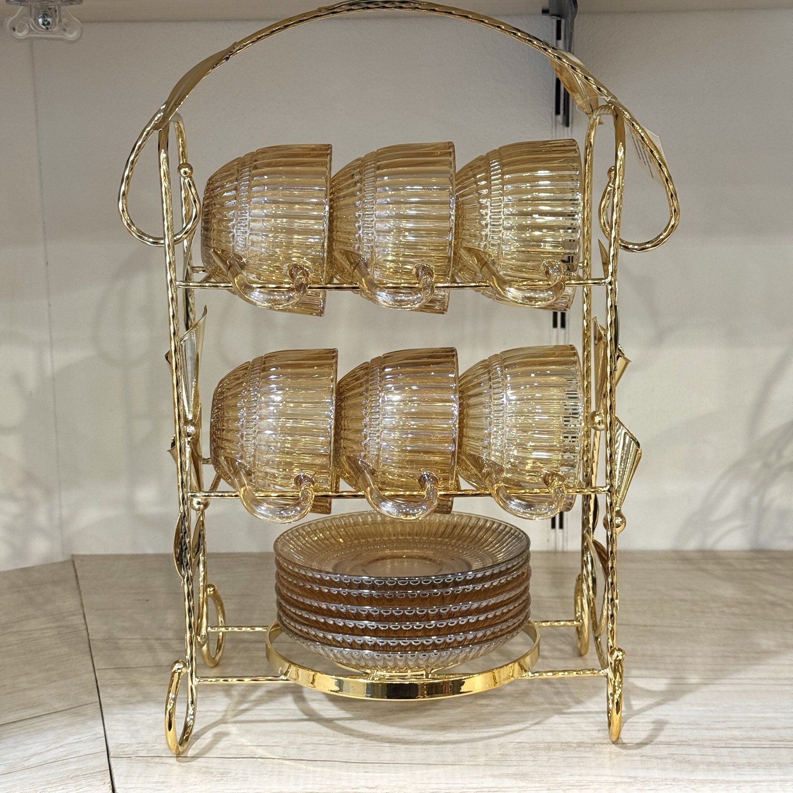 طقم مجات فاخر على حامل معدني ذهبي هيضافة رقي وأناقة على سفرتك وضيافتك. مصنوع من زجاج عالي الجودة بلون مميز وتصميم مخطط عصري، مع ستاند معدني ذهبي متين بيجمع بين الشكل الجمالي والاستخدام العملي.