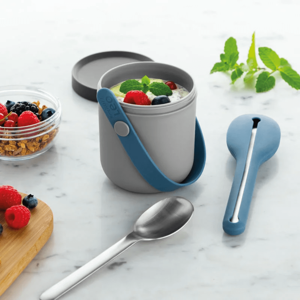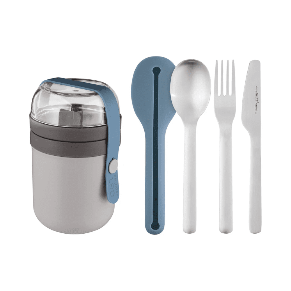 اللانش بوكس يحافظ على وجبتك مرتبة وسهلة النقل، بينما طقم أدوات المائدة المرافق يخلّيكي مستغنية عن الأدوات البلاستيك للاستخدام مرة واحدة. اختيار مثالي للناس اللي بتحب التنظيم والراحة في يومها.