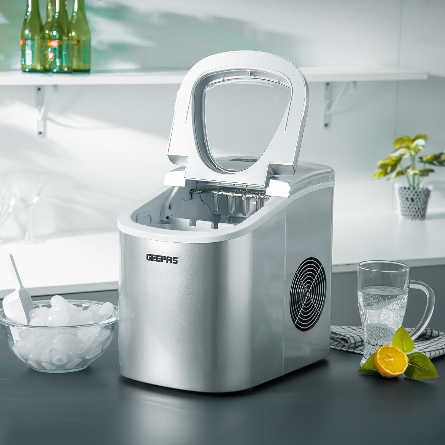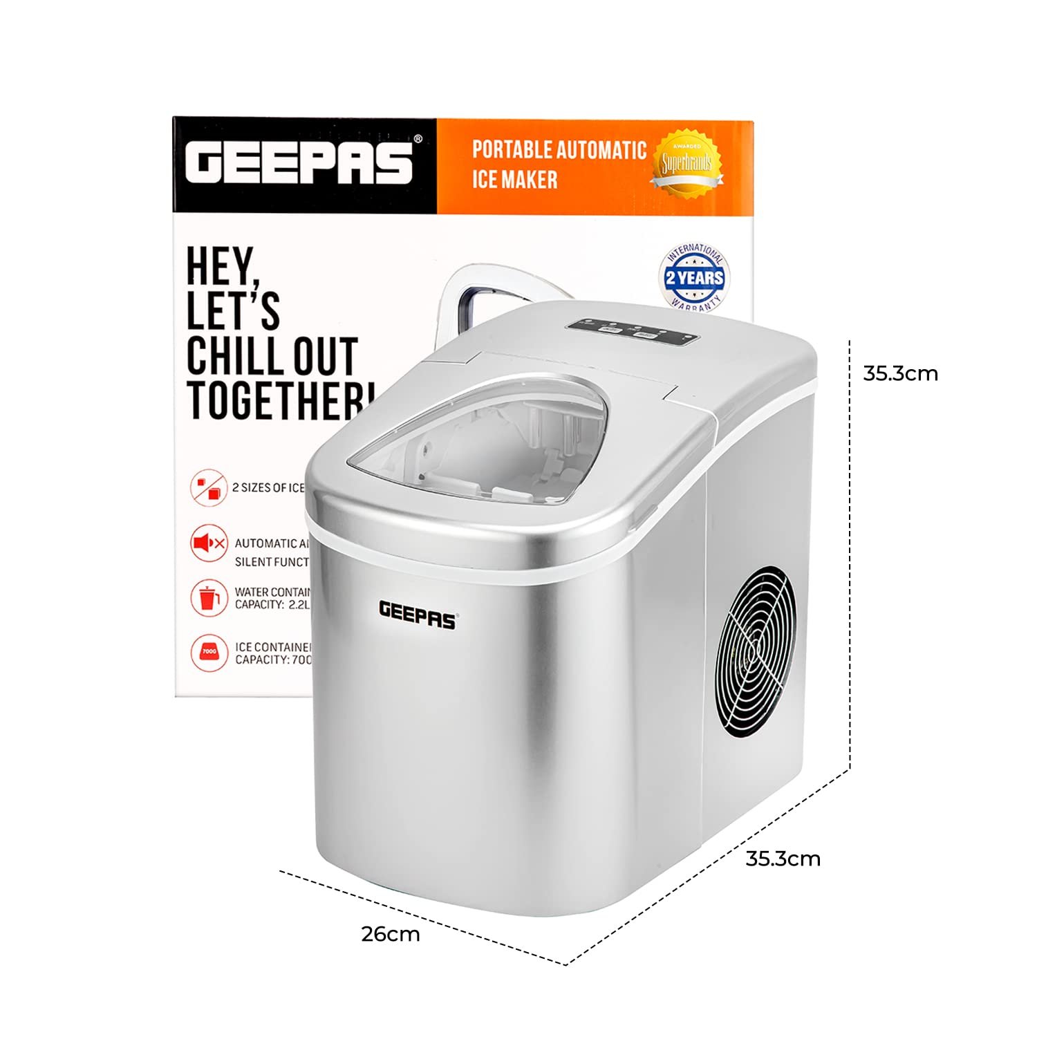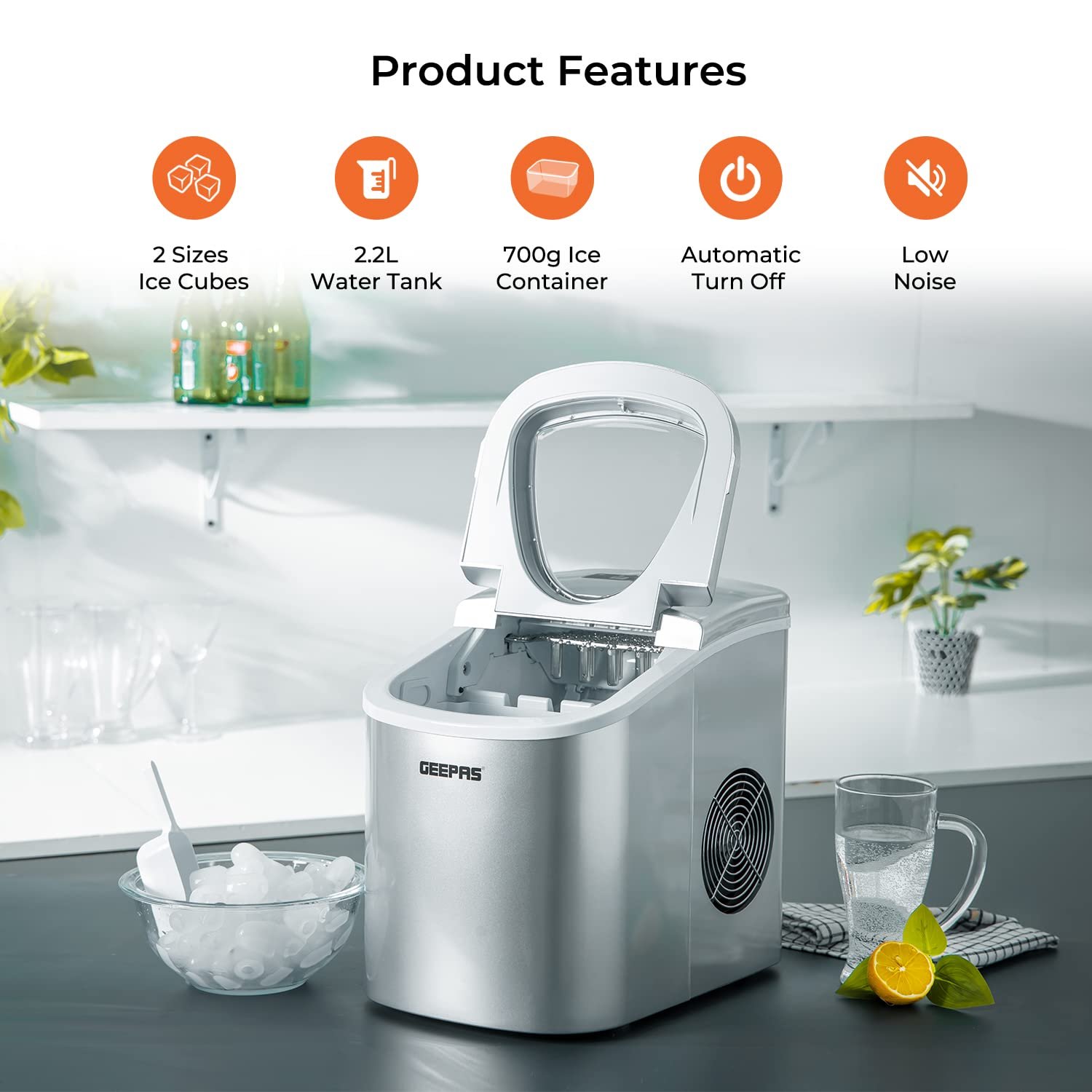 Geepas Ice Cube Maker, Two Sizes, Produces 12Kg In 24 Hours – Container 700G, Water 2.2L, Ecological Gas, Automatic Functioning