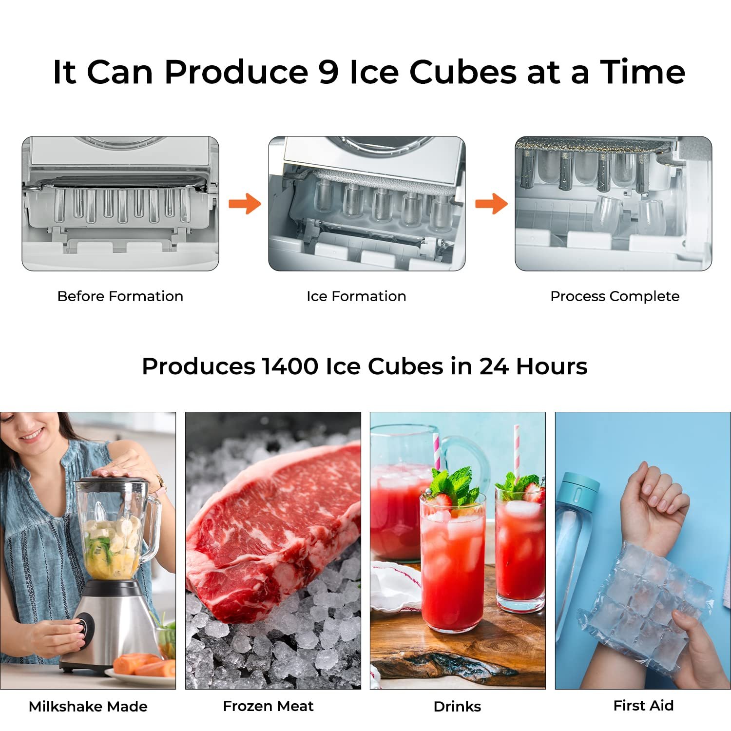 Production Capacity – This Ice Maker Provides 24 Hours Ice,Production. You Can Get A Total Of 12Kg Ice Within 24 Hours. That Is Equivalent To 1400 Cubes
