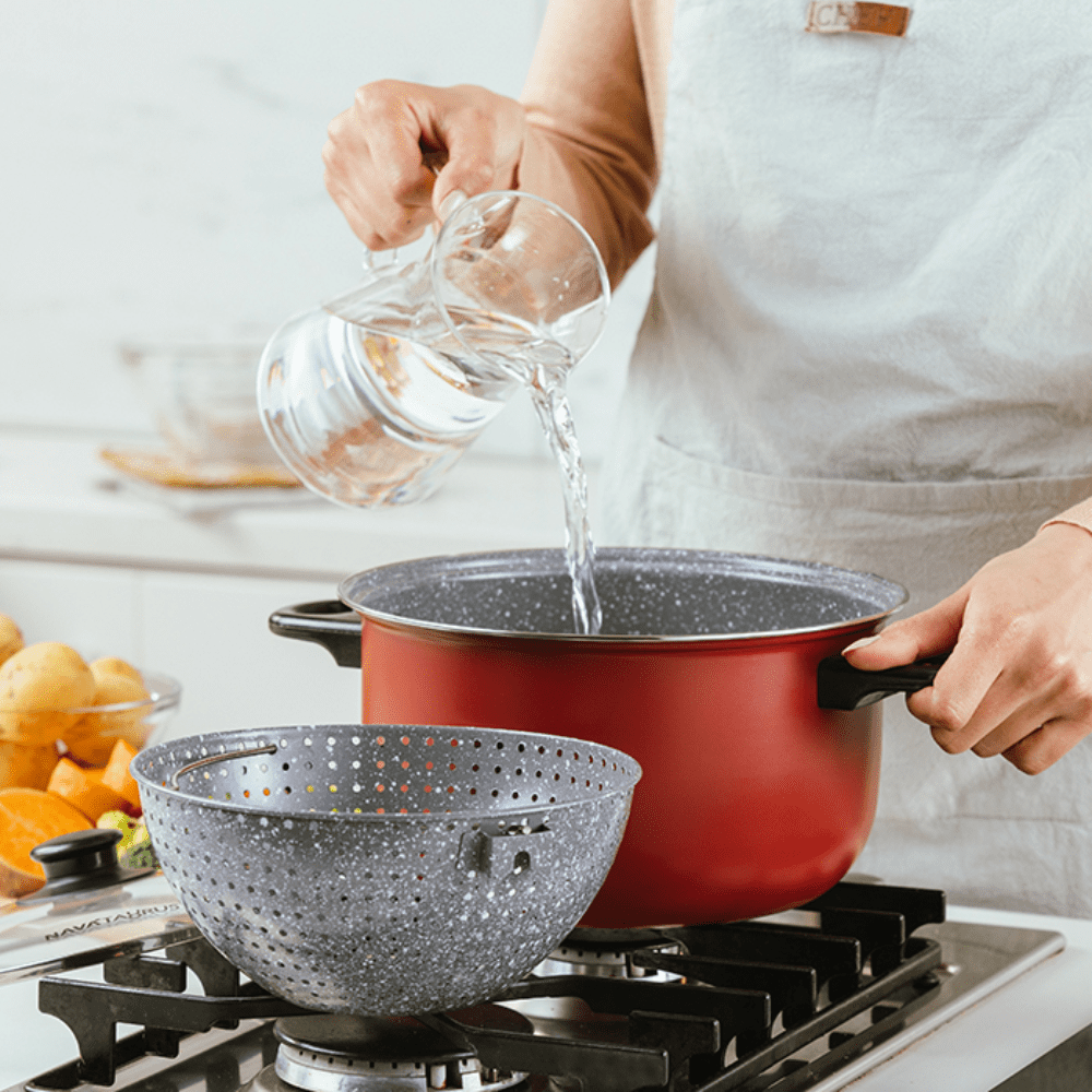 الغطاء مزوّد بفتحات تصفية لتصريف المياه بسهولة من الحلة بدون الحاجة إلى مصفاة خارجية.