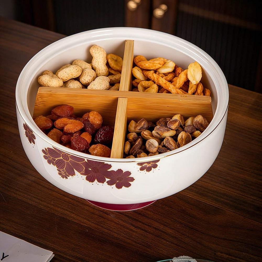 طبق تسالي بورسلين فاخر بتصميم عصري وأنيق مناسب لتقديم المكسرات والشيكولاتة والحلويات في العزومات والمناسبات. يتميز بشكل مرتفع يعطيه ثباتًا وأناقة على السفرة، مع غطاء يحافظ على المحتوى نظيف ومغلق بطريقة عملية.