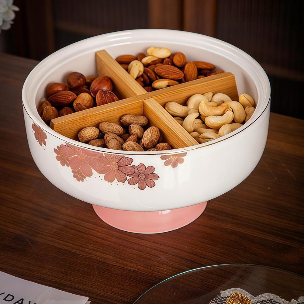 طبق تسالي بورسلين فاخر بتصميم عصري وأنيق مناسب لتقديم المكسرات والشيكولاتة والحلويات في العزومات والمناسبات. يتميز بشكل مرتفع يعطيه ثباتًا وأناقة على السفرة، مع غطاء يحافظ على المحتوى نظيف ومغلق بطريقة عملية.