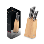 الطقم الأنيق ده بيشمل قاعدة خشبية متينة وعصرية لتخزين السكاكين بشكل مريح وعرضها على الرخام
