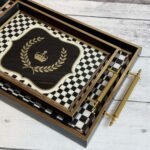 الصواني مزودة بمقابض جانبية لسهولة الحمل والثبات أثناء التقديم، مما يجعلها مثالية لتقديم المشروبات، الحلويات، الفطور، أو الاستخدام كقطع ديكور على الطاولات. كما يمكن استخدامها في المطبخ لتنظيم الأدوات أو في غرف المعيشة لتقديم الضيافة بشكل أنيق.