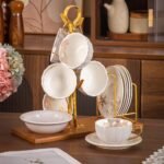 طقم القهوة بالحامل هو اختيار مثالي لكل من يبحث عن الأناقة والعملية في آن واحد. يتميز الطقم بتصميم راقٍ يجمع بين الهدوء والفخامة، مع حامل معدني ذهبي يُسهّل تنظيم الطقم ويمنحه مظهرًا جذّابًا يناسب جميع ديكورات المنزل.مصنوع من خامات سيراميك عالية الجودة، ليمنحك تجربة ضيافة متكاملة تدوم لفترة طويلة دون بهتان أو خدوش.