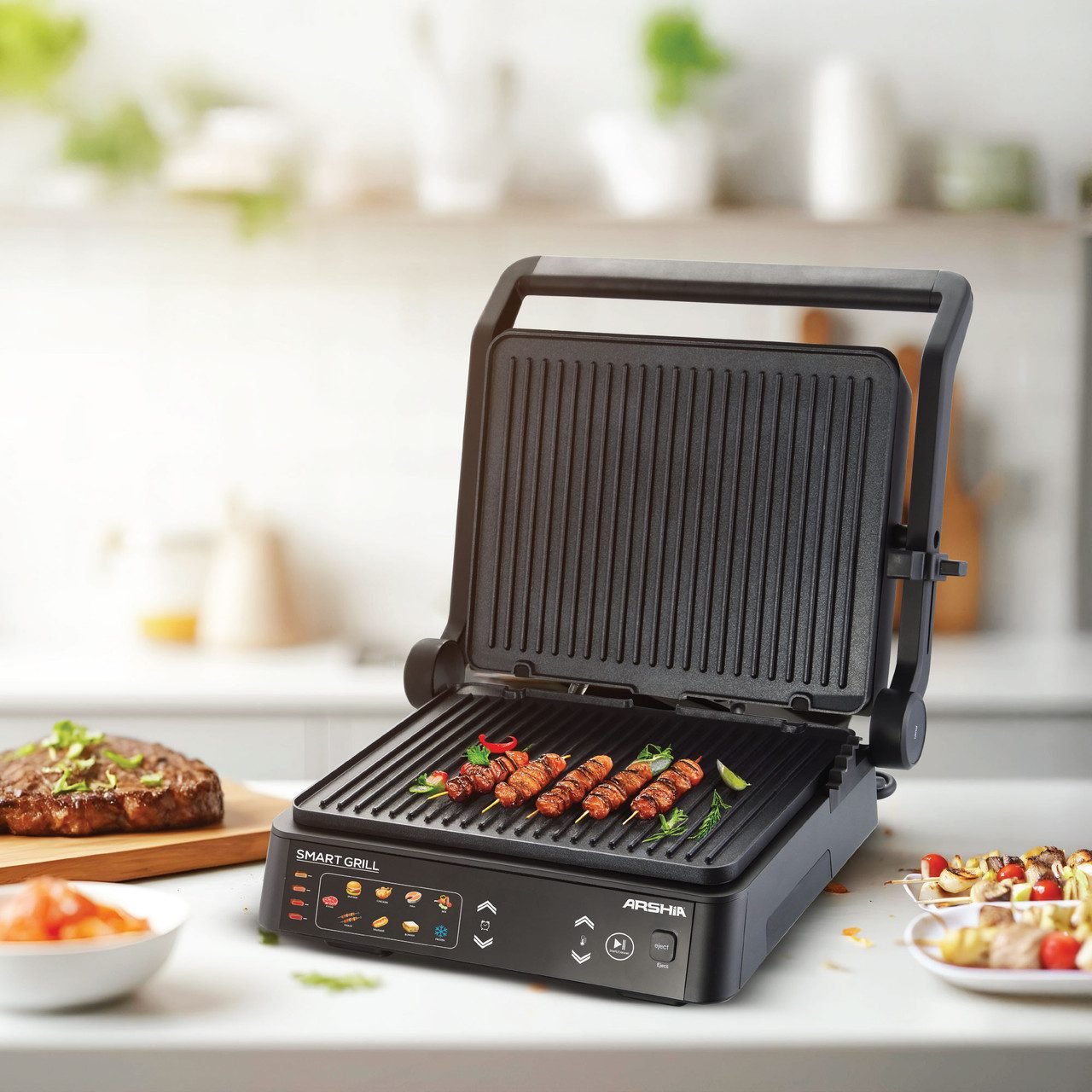 Cooking great food should be simple. The Arshia Smart Grill Pro is your new go-to for creating delicious, perfectly grilled meals right on your countertop. Designed to adapt to any recipe, it easily transforms from a compact press into a large, open grill, making it the perfect partner for everything from quick weeknight dinners to special weekend feasts.