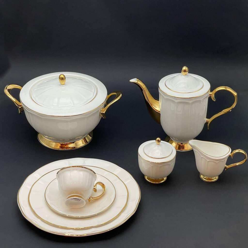 رويال ألفريدو طقم سفرة بورسلين 112 قطعة أوف وايت وذهبي – MO001